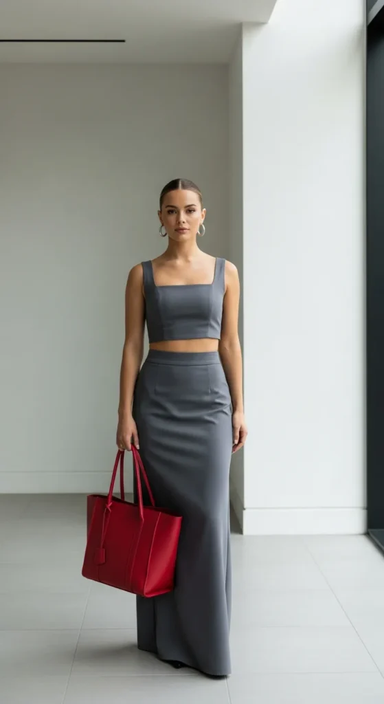 A monochrome outfit with a matching top and maxi skirt creates a sleek, elongated look. It feels modern, clean, and effortlessly stylish without trying too hard.