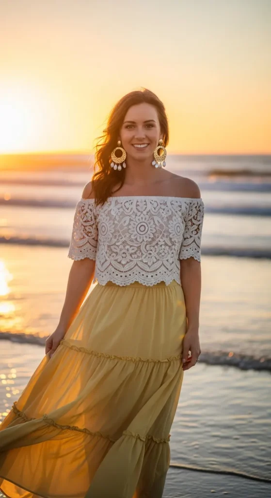 An off-shoulder top styled with a tiered maxi skirt brings a romantic, breezy charm. The movement of tiers combined with the neckline creates a soft, feminine energy.
