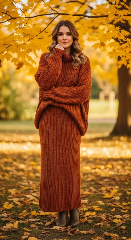 An oversized sweater styled with a knit maxi skirt feels cozy yet put together. The matching textures create a harmonious look that’s perfect for cooler days.