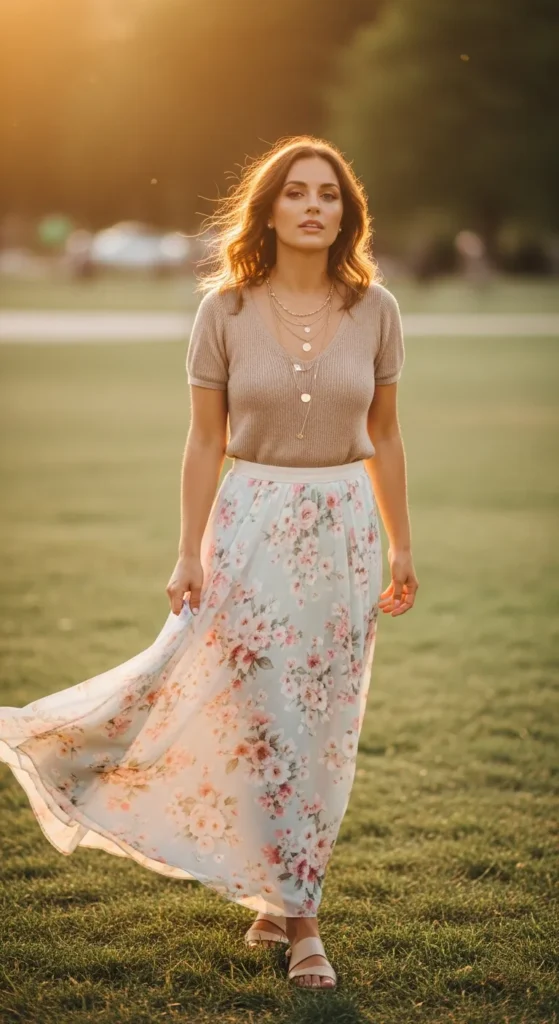 A lightweight knit top paired with a breezy floral maxi skirt creates a relaxed yet feminine silhouette. The soft textures balance movement, making it perfect for slow mornings or casual strolls under warm sunlight.
