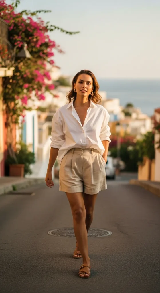 A slightly unbuttoned oversized white shirt paired with airy linen shorts feels clean and fresh. The relaxed fit creates movement while keeping things light, perfect for warm afternoons and casual city strolls.