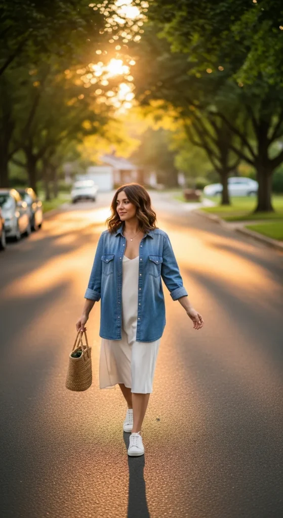 A soft oversized shirt half-tucked into distressed denim shorts gives a laid-back, carefree feel. It’s casual yet styled enough for everyday errands or coffee runs.
