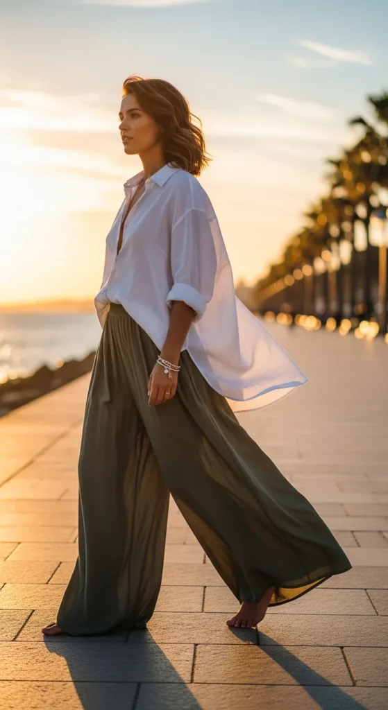 Pair a soft oversized shirt with wide palazzo pants for maximum airflow and comfort. The movement of both pieces creates an effortlessly graceful look.