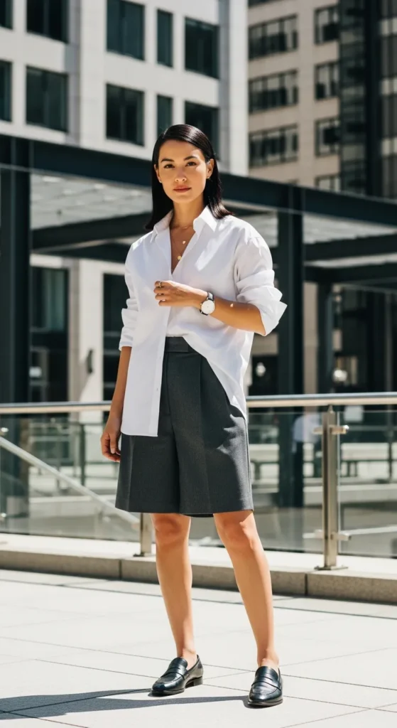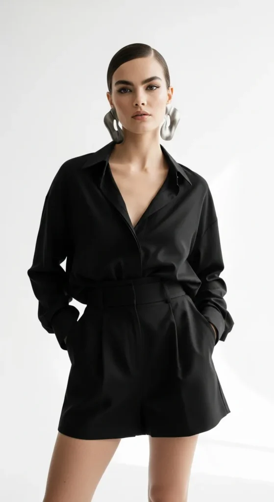 Combine an oversized shirt with structured tailored shorts for a refined yet relaxed look. The contrast between sharp lines and soft draping feels elevated.