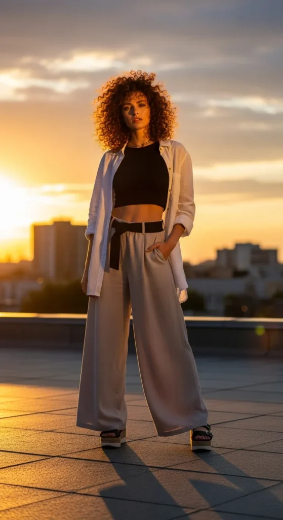 Leave your oversized shirt open over a fitted crop top and flowy wide-leg pants. This layered look feels airy and dimensional, ideal for warm evenings.
