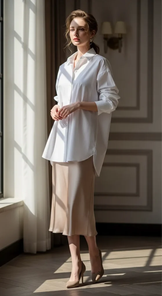 Pair a silky slip skirt with a loosely tucked oversized shirt. The mix of textures, soft shine and structured cotton, creates an elegant yet approachable outfit.