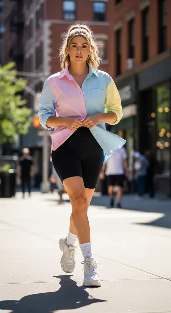 Layer an oversized shirt over fitted biker shorts for a balanced silhouette. The contrast between loose and fitted creates a confident, modern summer outfit.