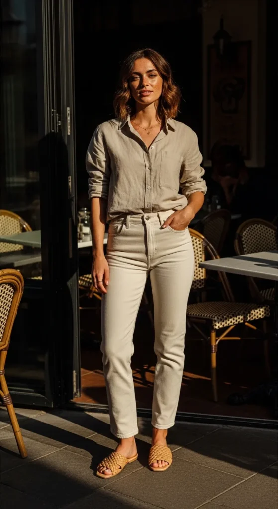 A relaxed linen button-down tucked loosely into straight-leg jeans creates an airy, polished vibe. Soft neutrals or pastel tones keep it fresh, while rolled sleeves add a casual summer touch perfect for daytime errands or coffee runs.
