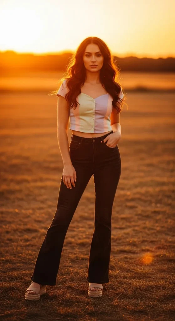 Stylist Suggestion: Choose platform sandals and soft waves in your hair. The added height complements flares, while loose hair enhances the vintage-inspired softness of the outfit.