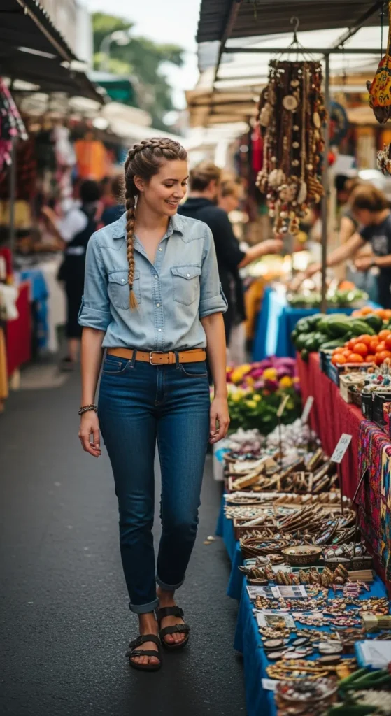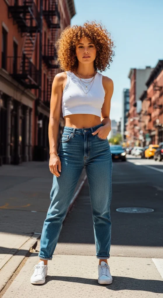 A fitted cropped tank paired with slightly faded high-waisted jeans feels youthful yet grounded. The contrast between structure and ease creates a flattering silhouette that works beautifully for warm afternoons and casual meetups.