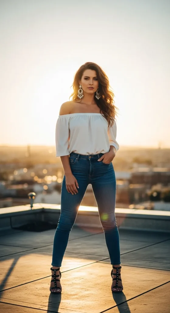 An off-shoulder top paired with fitted jeans feels subtly romantic and feminine. It highlights the neckline while keeping the rest of the outfit simple and balanced for warm-weather outings.