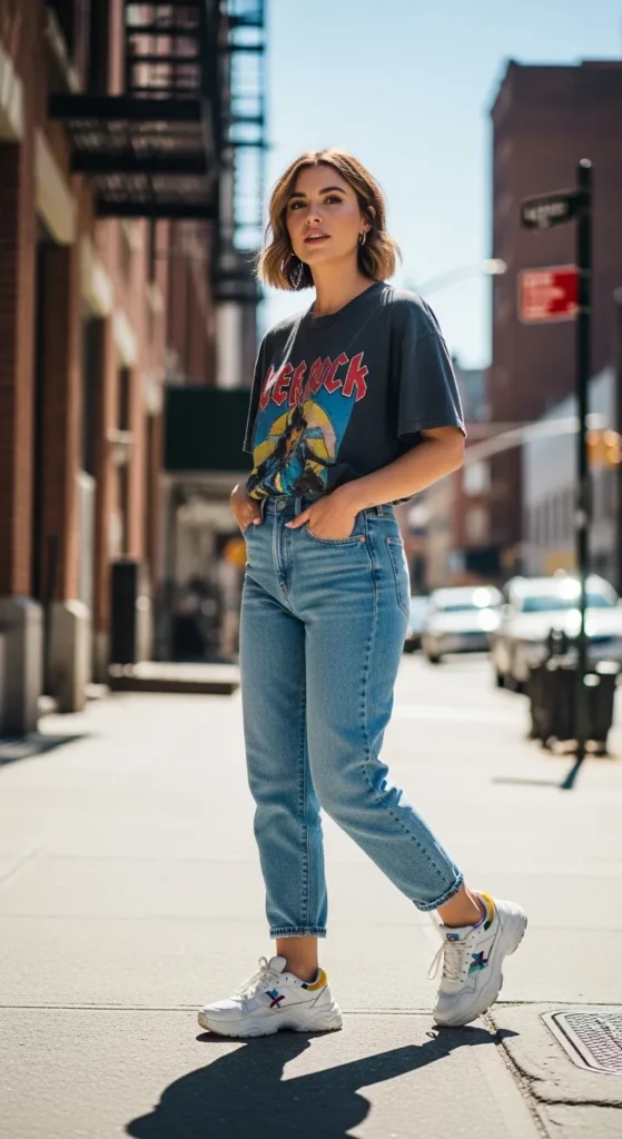 An oversized graphic tee tucked halfway into light-wash jeans gives a relaxed, expressive look. It feels personal and slightly edgy, perfect for days when comfort and personality matter more than precision.
