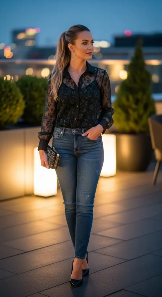 A sheer, slightly textured top layered over a simple inner piece adds depth to classic blue jeans. It feels airy and visually interesting, perfect for summer evenings with a soft breeze.