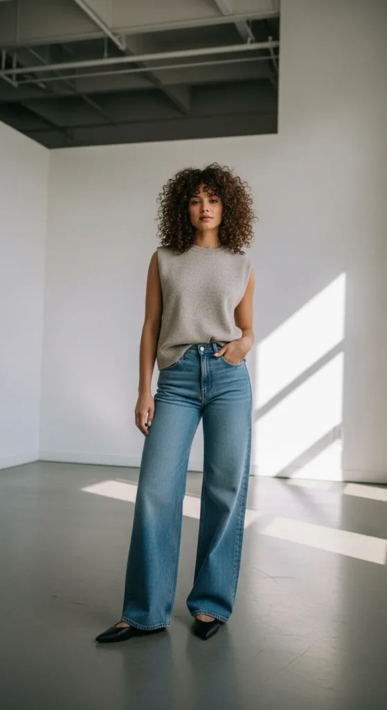 A lightweight sleeveless knit paired with wide-leg jeans creates a soft, flowing silhouette. The combination feels modern and easy, perfect for days when you want comfort without sacrificing style.