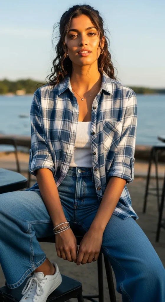 Wearing a checked flannel or cotton shirt open over a thin cami with wide leg jeans is one of those genuinely relaxed looks that always ends up being the most photographed outfit of the day. It is that kind of effortless.