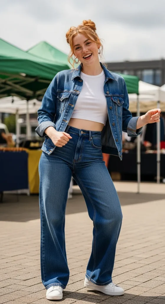 11. Denim Jacket Over a Crop Top With Wide Leg Jeans