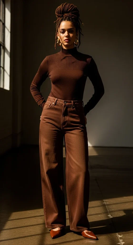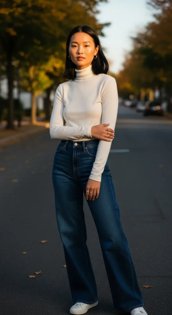 5. Fitted Turtleneck and Wide Leg Jeans for Cooler Days