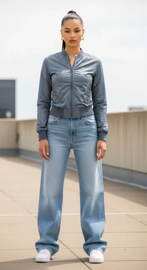 A fitted zip-up jacket, especially in a muted tone like olive, cream, or slate, worn with wide leg jeans creates a really clean and modern silhouette. It is sporty but in a polished, not athletic, way.