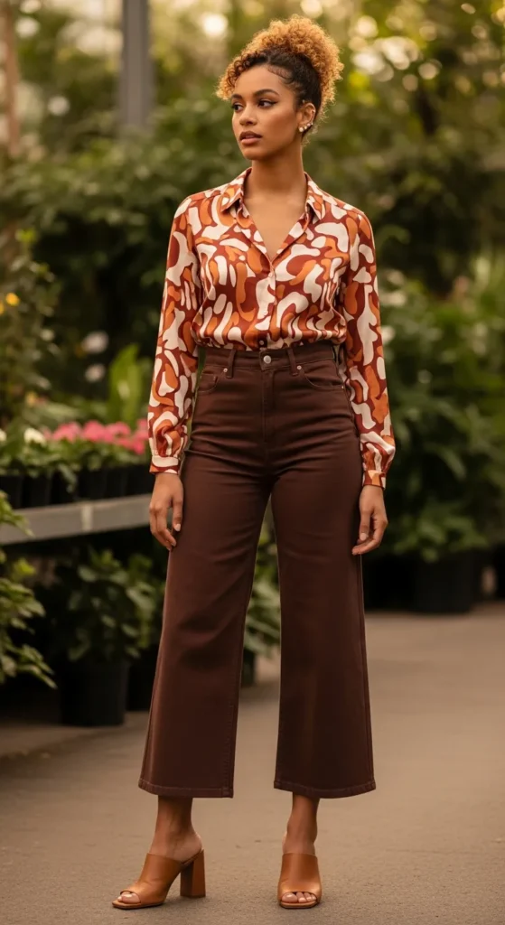 A flowy printed blouse, something with a subtle floral or abstract print, tucked into wide leg jeans looks incredibly put together while still feeling free and relaxed. The contrast between fluid fabric and structured denim is really striking.