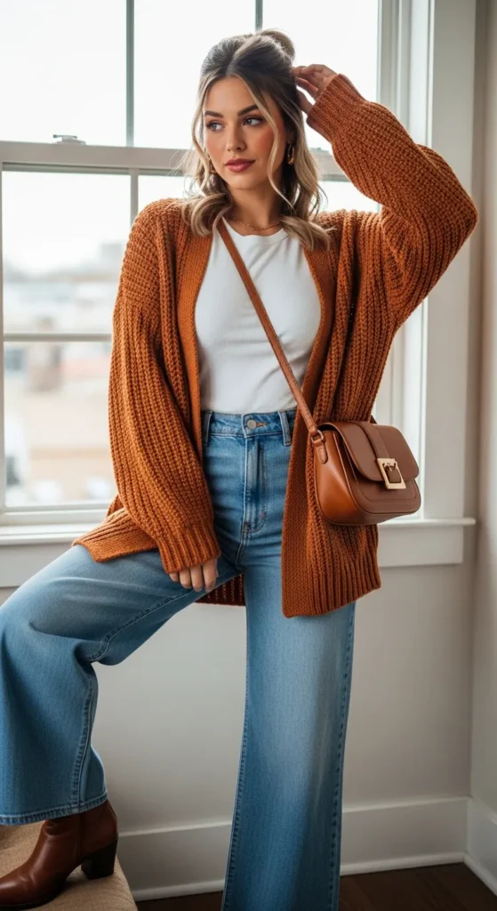 There is genuine coziness in wearing a knit cardigan open over a white tee with wide leg jeans, especially in autumn. It layers beautifully without adding bulk, and the open cardigan creates a vertical line that is very flattering.