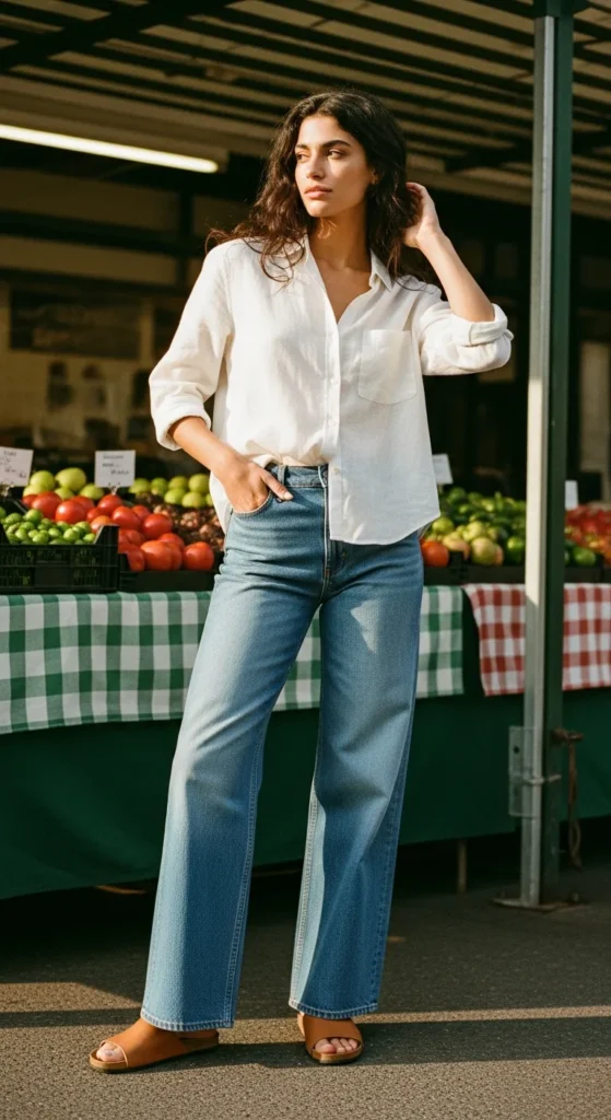 A linen button-down half tucked into wide leg jeans looks like you grabbed it off a chair and somehow made it look intentional. It has that effortless, breezy quality that feels genuinely relaxed, not sloppy.