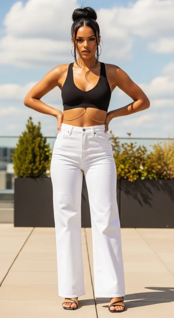 A longline sports bra or bralette worn with high-rise wide leg jeans is a genuinely stylish combination that works for brunch, errands, or a casual evening out in warm weather. The high rise meets the crop perfectly at the waist.