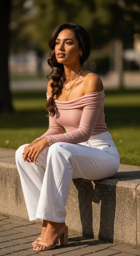 An off-shoulder top with wide leg jeans is a combination that feels genuinely romantic and feminine without leaning into anything fussy. It shows just the right amount of skin without the outfit becoming about that.