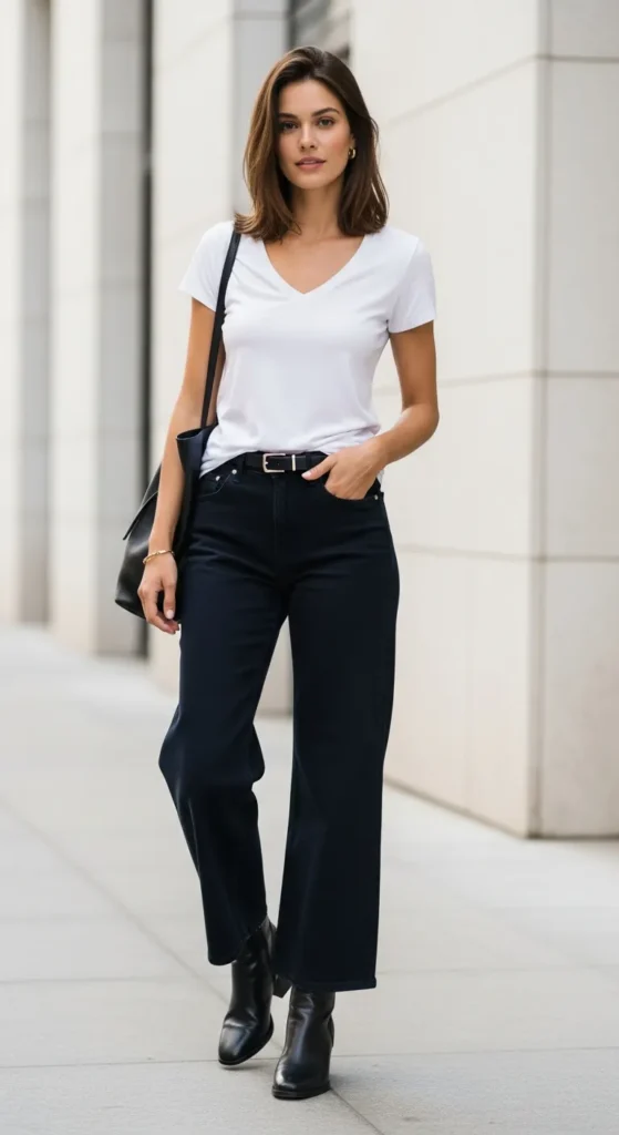 Stylist Suggestion: Add a simple black or brown leather belt at the waist and wear ankle boots in a matching dark tone. The belt and boots create a monochromatic anchor beneath the white tee that makes the entire look feel considered and finished.