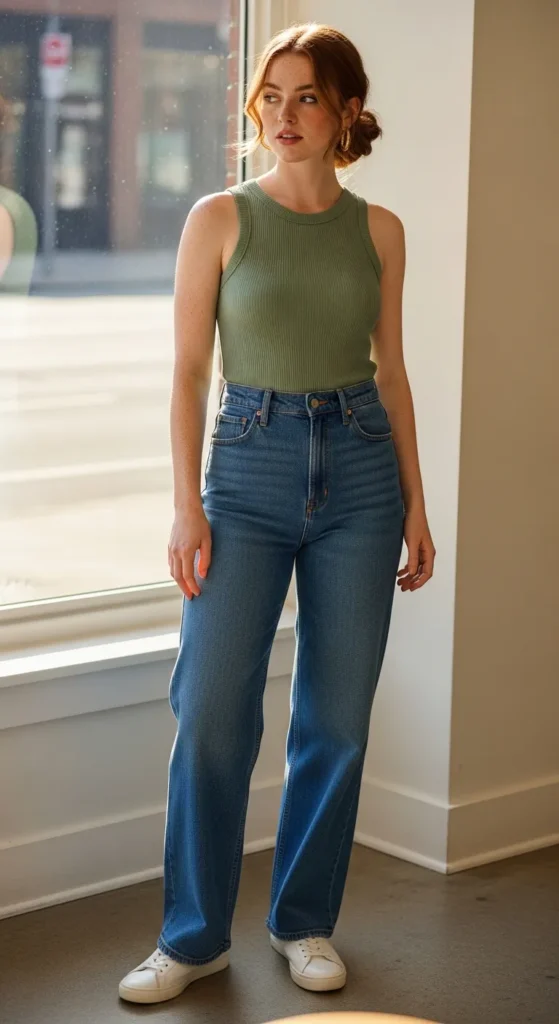 A ribbed tank tucked snugly into high-waist wide leg jeans is one of those outfits that photographs beautifully but also just feels really good to wear. The waist definition does all the work for you.