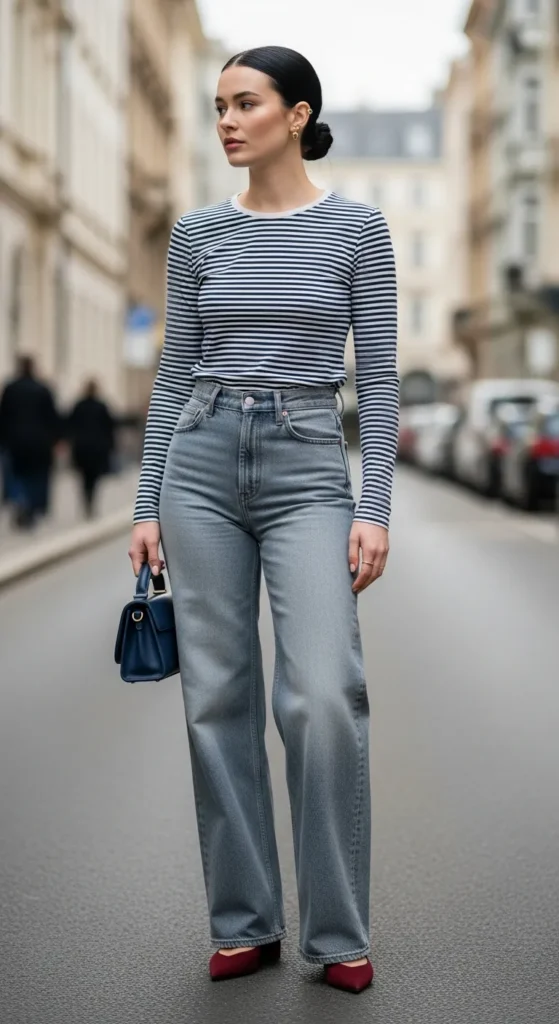 Stylist Suggestion: Add chunky white sneakers and a small crossbody bag in a contrasting color. The volume of the wide leg jeans needs a grounded shoe to balance it out, and a chunky sole does exactly that without making the outfit feel heavy.