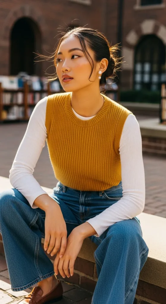 A sweater vest layered over a long sleeve fitted tee tucked into wide leg jeans is one of those outfits that feels very intentional and put together. It is the kind of layering that looks like you thought about it, even if you did not.