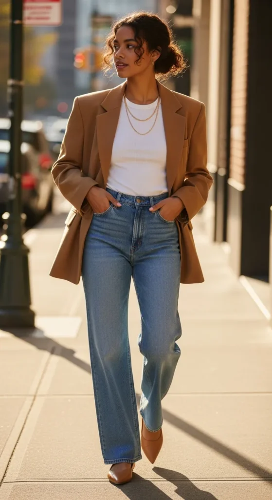 There is something about throwing a slightly oversized blazer over a simple tucked-in tee with wide leg jeans that just feels like you have your life together. It is polished without trying too hard, and that balance is everything.