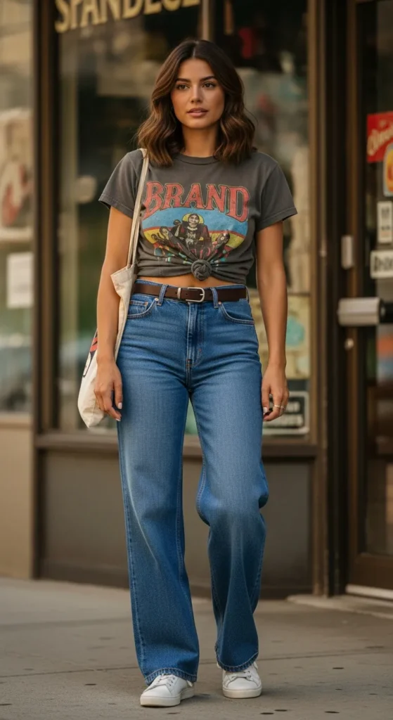 A vintage or faded graphic tee tucked into the front of wide leg jeans hits that sweet spot between nostalgic and current. It gives personality to an otherwise simple denim outfit without screaming for attention.