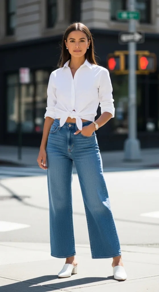 Tying a crisp white dress shirt at the waist over wide leg jeans is one of the easiest ways to look stylish on a completely average Tuesday. The knot adds shape and the white pops against every denim wash.