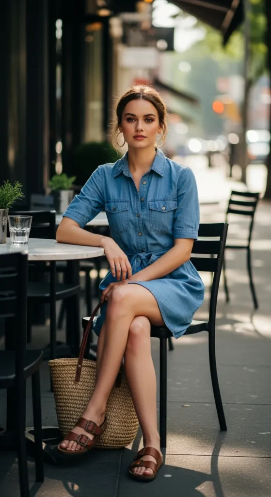 A short-sleeve button-up dress in lightweight cotton or chambray paired with leather sandals creates a structured yet airy look. Perfect for casual meetings or brunch.