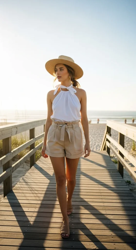 A cotton halter top paired with paperbag waist shorts is breathable, playful, and stylish. The halter neckline draws focus upward while shorts allow air circulation.