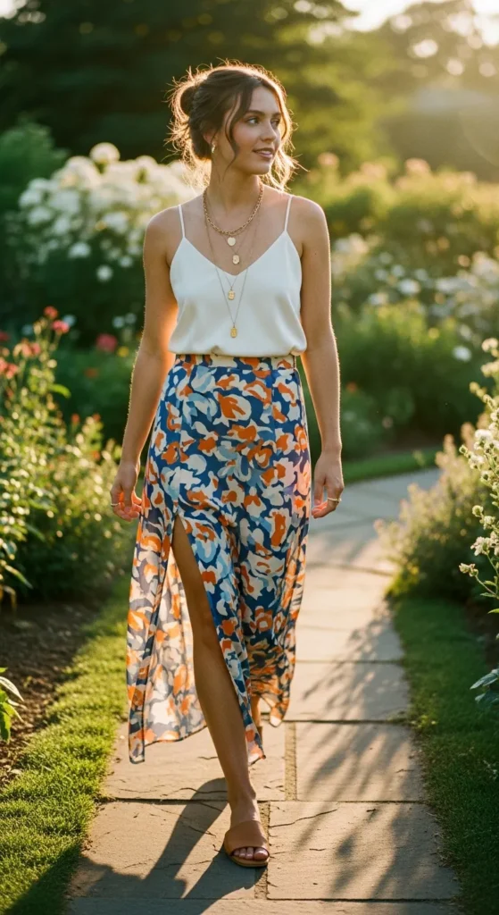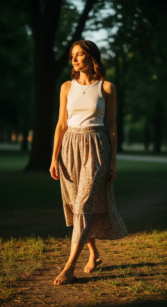 A slim-fitting strappy tank paired with a flowy midi skirt balances fitted and loose elements. Breathable fabrics keep the outfit comfortable for daytime errands or brunch.
