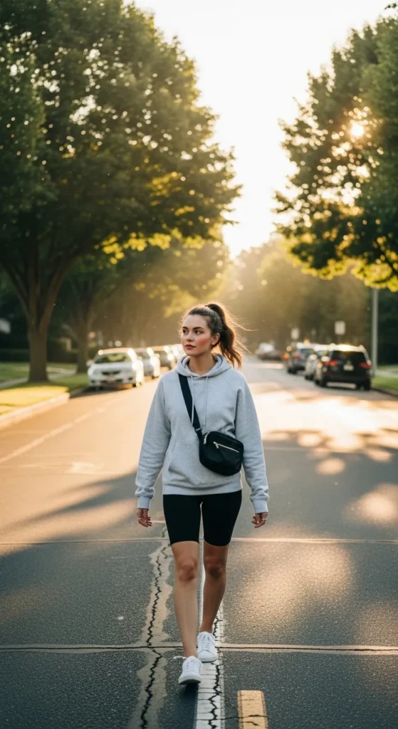 For slightly cooler humid days, a thin cotton hoodie over bike shorts balances comfort and style. The hoodie is breathable and perfect for early mornings or evenings.