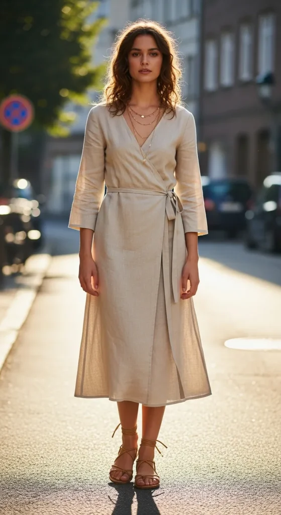 A lightweight linen wrap dress in soft beige paired with tan strappy sandals keeps your body cool while adding movement. The wrap detail flatters your waist and gives a breezy, elegant vibe.