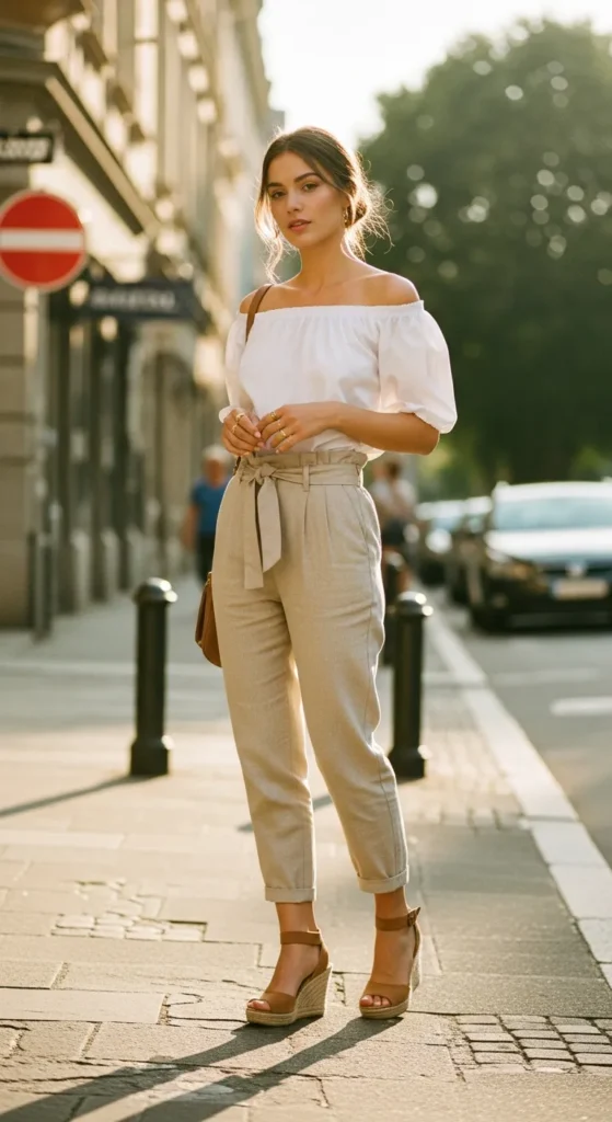 A cotton off-shoulder blouse with airy paperbag waist linen pants is stylish yet breathable. The off-shoulder design keeps shoulders exposed, reducing heat retention.
