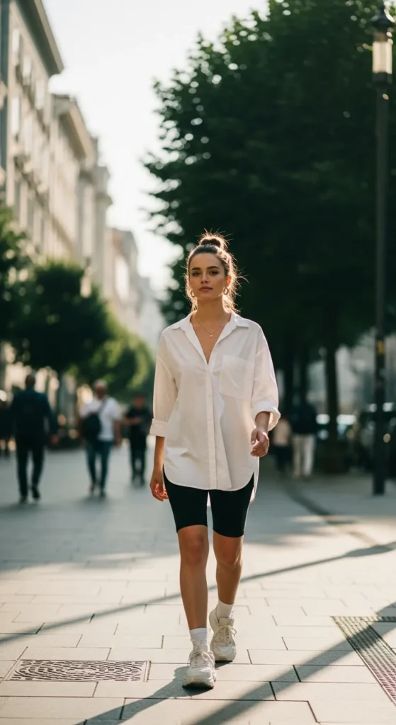 An oversized cotton or linen button-down layered over fitted biker shorts offers a trendy yet breathable outfit. The loose top keeps air flowing while shorts provide comfort and mobility.