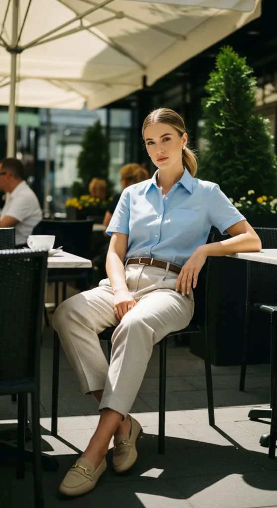 A short-sleeve button-down shirt tucked into linen trousers combines polish with comfort. Breathable fabrics prevent sticking in humidity while maintaining a professional-casual balance.