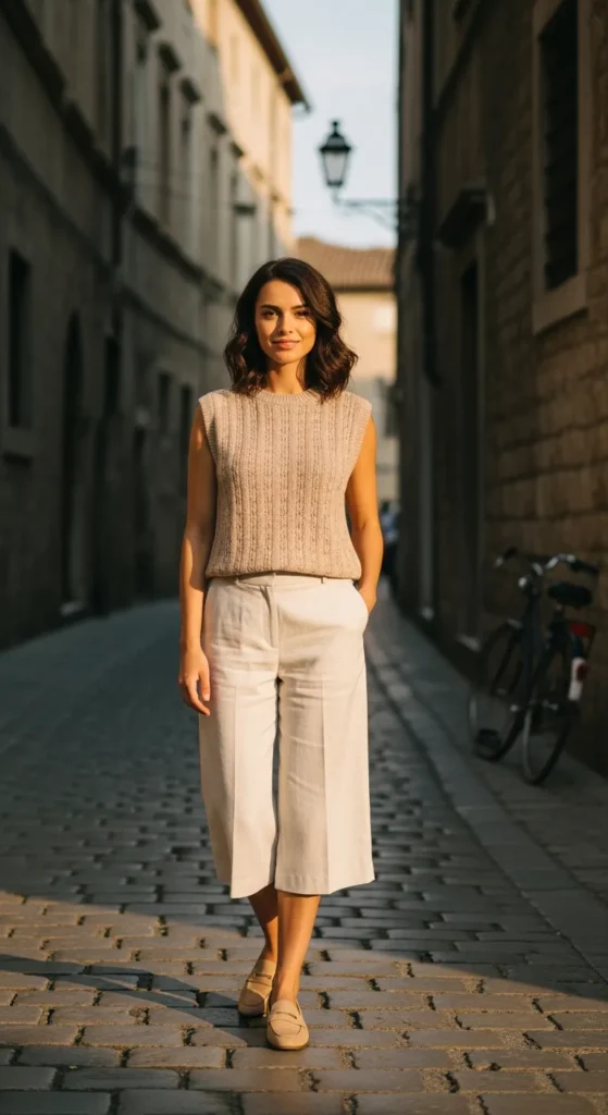 A sleeveless knit top tucked into linen culottes creates a polished yet breathable outfit. Light fabrics maintain airflow while the silhouette looks sophisticated.