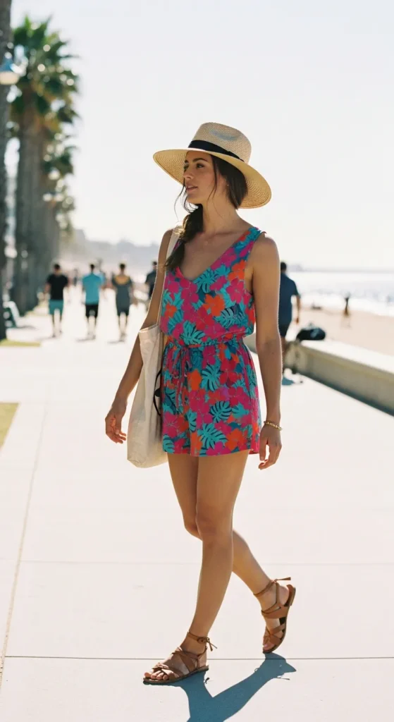 A sleeveless printed romper is breathable and playful, perfect for day trips in humid conditions. Pairing with a wide straw hat ensures sun protection and a chic summer look.