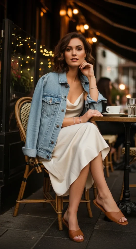 A silk or satin slip dress keeps you cool while offering a touch of elegance. A light denim jacket thrown over shoulders adds casual contrast for evening wear without overheating.