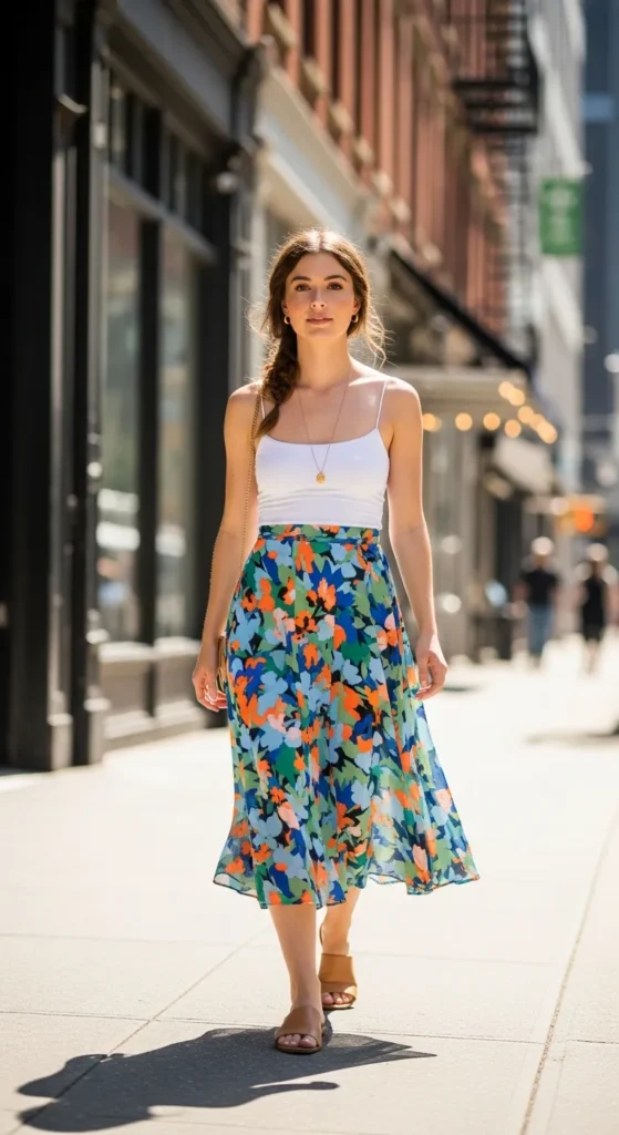 A printed flowy midi skirt paired with a solid cotton tank top creates a playful, breezy look. Movement in the skirt ensures air circulation and adds effortless feminine charm.
