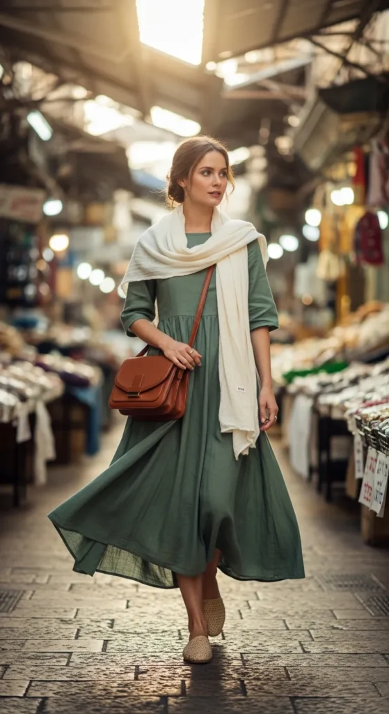 A soft cotton midi dress in muted sage paired with a draped scarf offers grace and flexibility. You can wrap the scarf over your shoulders inside sacred spaces and let it fall loosely while strolling open-air markets.