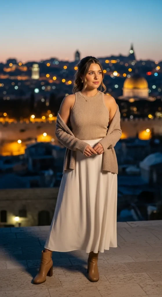 A ribbed tank tucked into a neutral midi skirt topped with a light cardigan feels cozy for cooler Jerusalem evenings. It’s layered without feeling bulky.