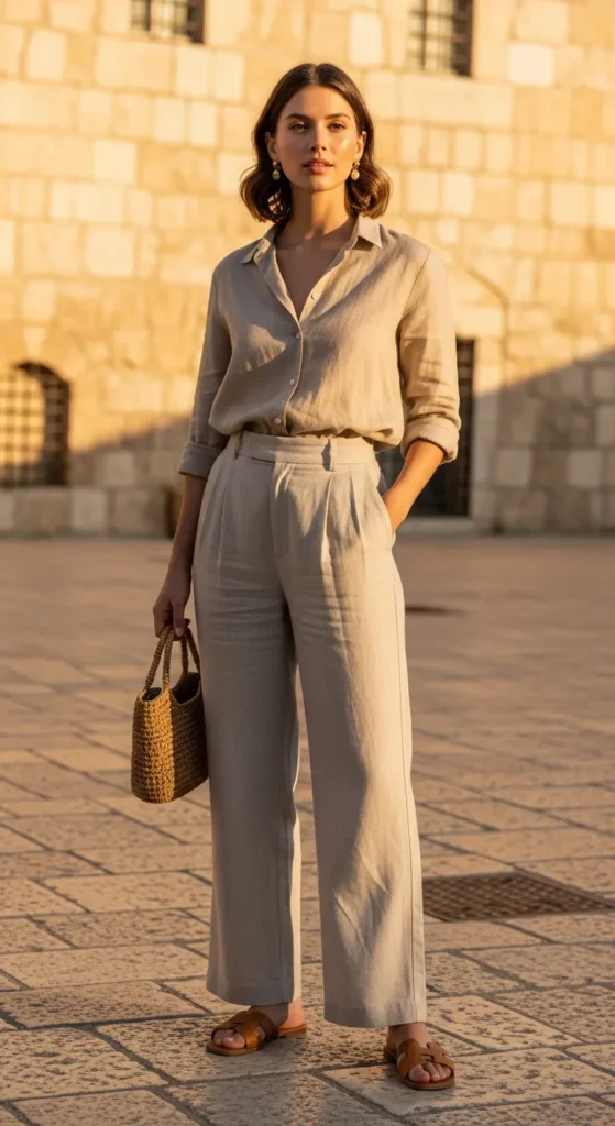 A lightweight linen blazer in cream layered over a neutral tank and straight trousers works beautifully for museums and city dining. It feels smart but breathable in Israel’s warm climate.