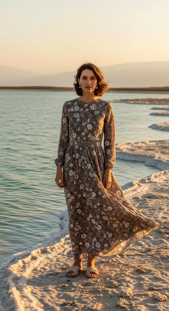 A muted floral maxi dress with long sleeves feels romantic but grounded. It sways beautifully in breezy open landscapes.